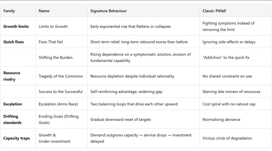 System archetypes are recurring structural patterns—combinations of stocks, flows, feedback loops, and delays—that generate familiar behaviours across wildly different domains. Spotting an archetype lets you skip exhaustive data gathering and move straight to high leverage interventions.