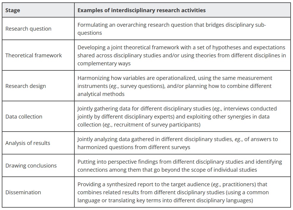 Fundamental to the typology is that, in principle, interdisciplinary integration can occur at any stage of the research process, as illustrated in the table below. The stages and examples in the table reflect an empirical research process and would look different for other types of research processes.