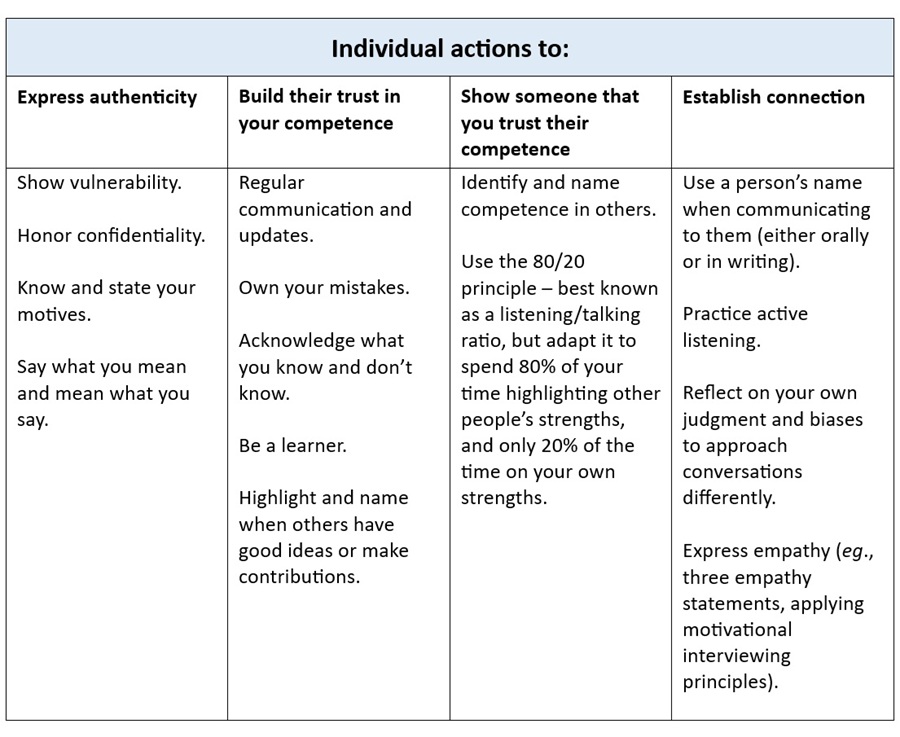 Building on your reflections, you can then identify actions that can help you build trust— actions to express authenticity, competence, and connection.