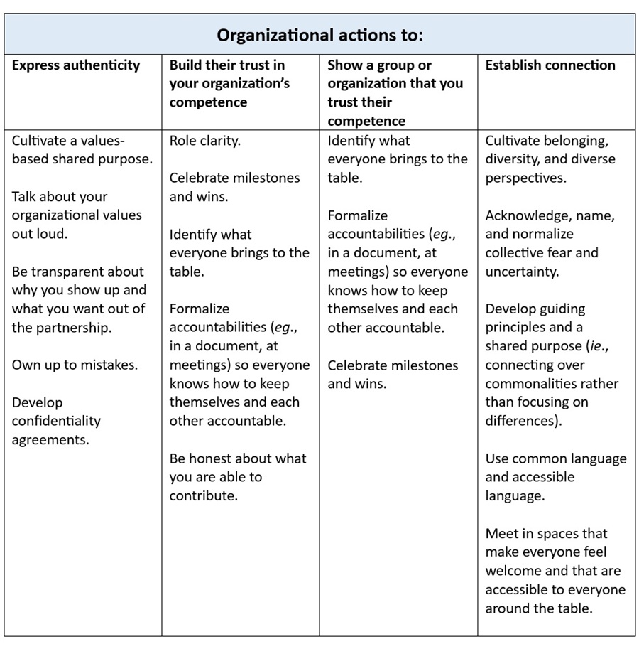 If you are looking for actions to build trust between groups or organizations, here are some examples.